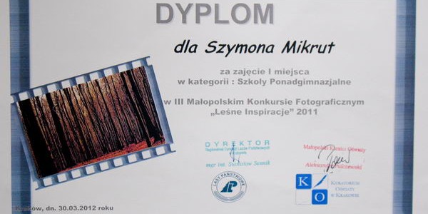 Laureaci ubiegłorocznego Małopolskiego Konkursu Fotograficznego „Leśne inspiracje” odebrali nagrody, dyplomy i wyróżnienia. Miło nam poinformować że uczeń 3 LO Szymon Mikrut zdobył 1 miejsce w kategorii szkół ponadgimnazjalnych.