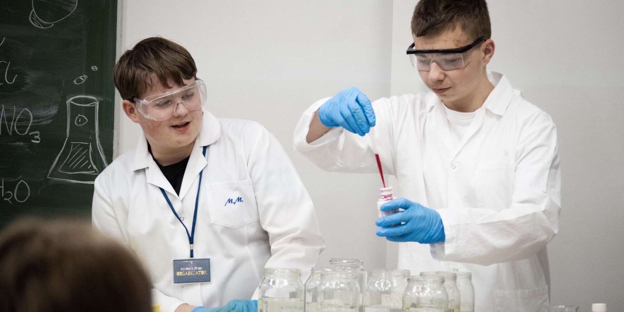 Podczas festynu na terenie szkoły przygotowano wiele stanowisk tematycznych – od m.in. geograficznych, przez historyczne, aż po chemiczne. Nasi uczniowie wraz z dwiema uczennicami z klasy 8B: Amelią Filip i Katarzyną Jękot szczególnie aktywnie uczestniczyli w części chemicznej, gdzie mieli okazję przeprowadzać efektowne doświadczenia, takie jak strącanie osadów, „pasta słonia” czy tzw. bomba glicerynowa. Nad prawidłowym przebiegiem doświadczeń oraz ich stroną merytoryczną czuwał Pan Wiesław Martowicz – nauczyciel chemii.