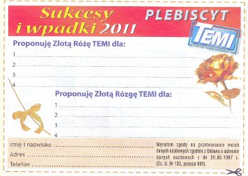 W ostatnim numerze TEMI z dnia 25 stycznia 2012 ukazał się artykuł na temat piątego plebiscytu o Nagrodę Złotej Róży. Możemy w nim przeczytać, że jednym z kandydatów do otrzymania tej nagrody jest nasze liceum. Zostaliśmy docenieni za wysoki poziom nauczania i rosnącą liczbę olimpijczyków. W naszej szkole jest także najwięcej stypendystów. Zagłosuj na naszą…